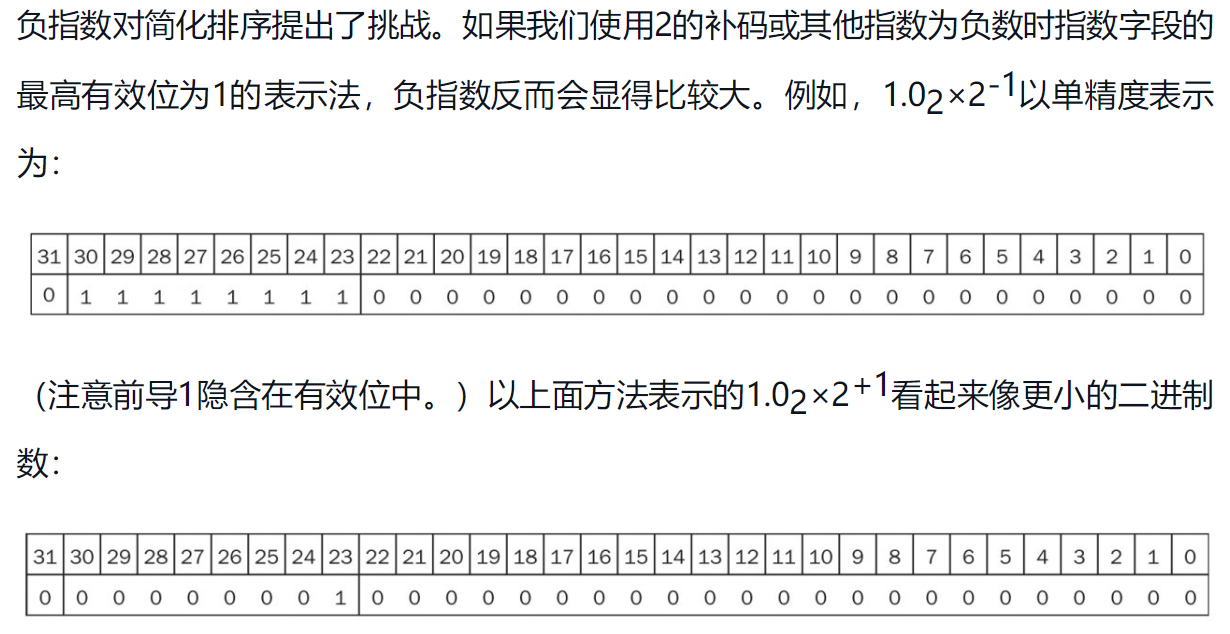 (1)对于浮点表示,尤其是进行排序操作时,最好能直接利用已有的整数比较硬件来处理,这就是符号位处于最高位的原因,这样一来就可以快速判定是小于0、大于0还是等于0;