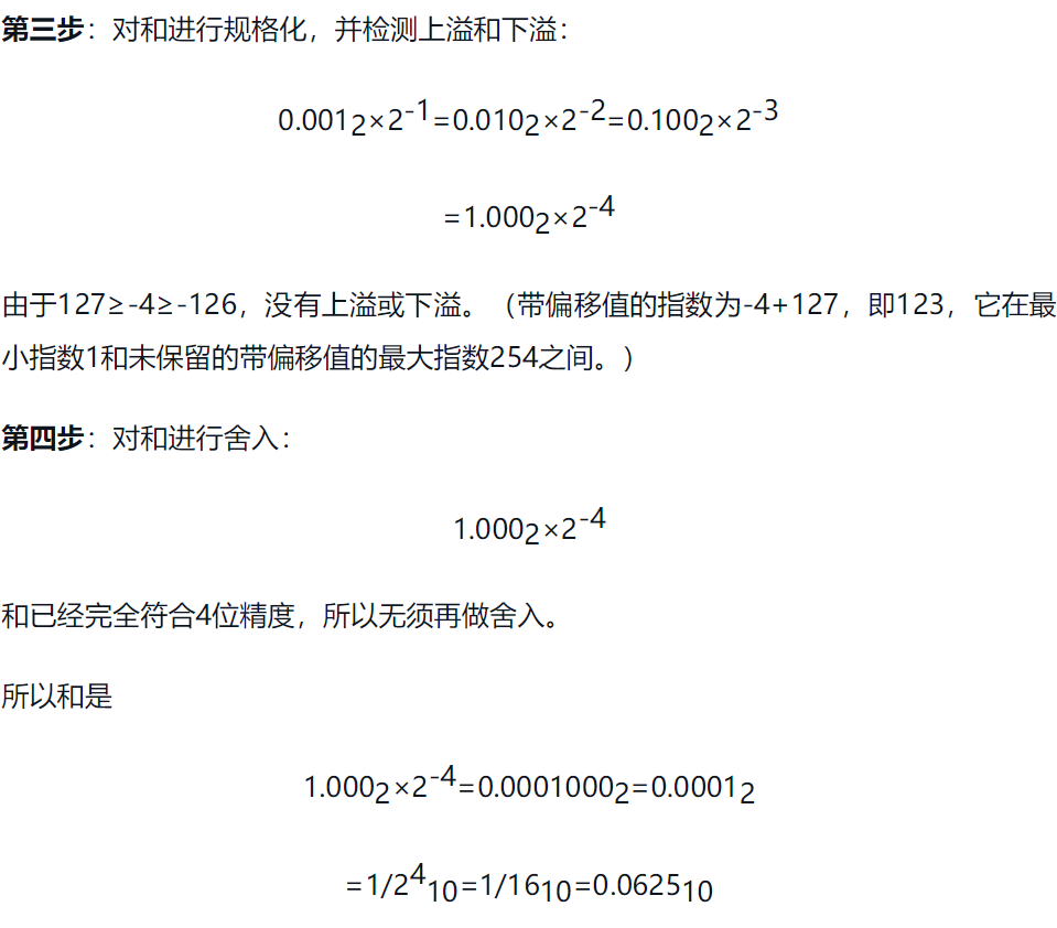 一定要记得检查上溢和下溢!!检查的标准是:指数加127后的值是否在1~254之间(这是正负规格数指数的合法范围)(如果发生溢出,程序会被[例外]打断)