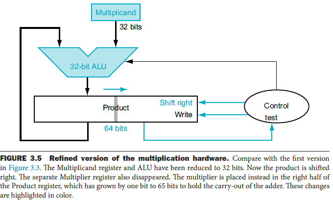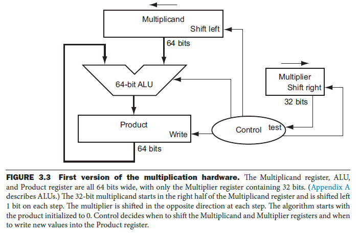 被乘数寄存器、ALU和乘积寄存器都是64位长,只有乘数寄存器是32位