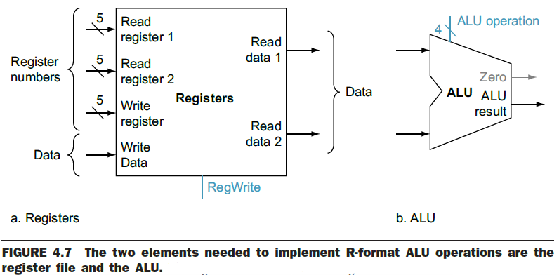 c) Write操作由控制信号 RegWrite 控制,在写操作发生的时钟边沿,写控制信号必须是 有效(asserted) 的(这里的表述是 “RegWrite是有效的” 而非 “RegWrite为1” , 是因为有时可能低电平0才是有效的);