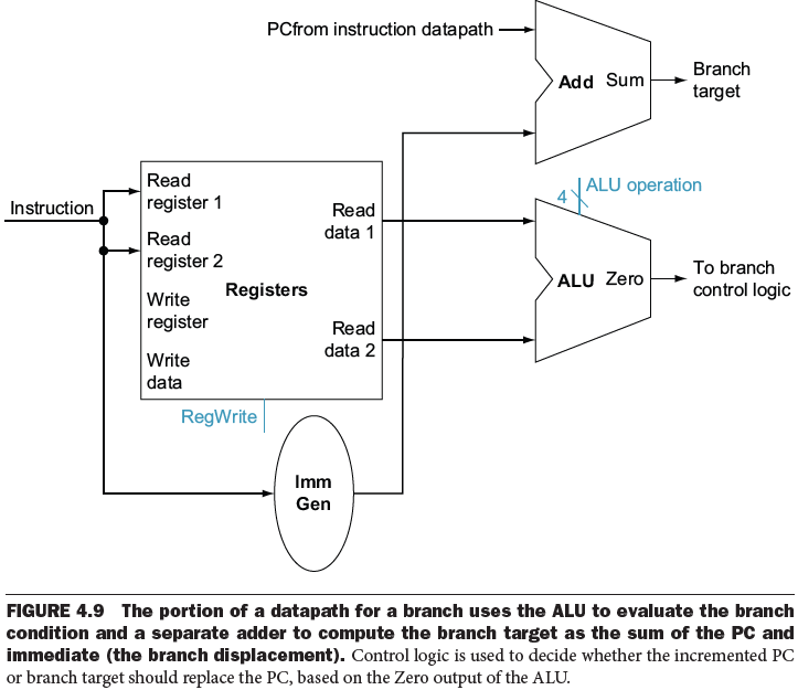为计算分支目标地址,分支指令数据通路包含一个ImmGen和一个加法器Add。为执行比较,需要寄存器堆(register file)提供两个寄存器操作数。此外,使用ALU完成相等性比较;
