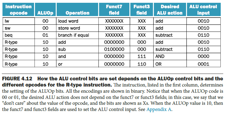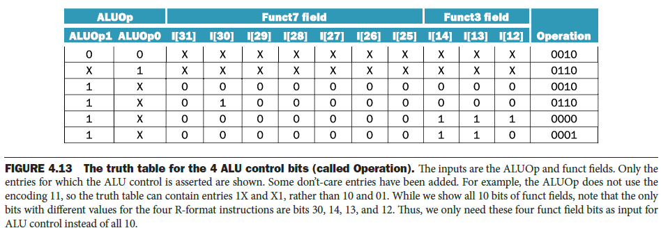 - 如果ALUOp=00或01,则ALU操作不依赖于funct7或funct3字段,在这种情况下,“不关心”操作码的值,所以将其记为一串X;