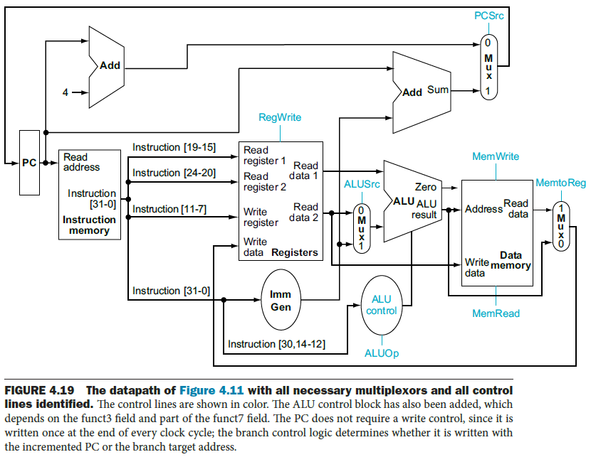 (若Branch信号和ALU的零输出信号相与的结果有效asserted,说明二者皆为有效,即当前指令是一个B型分支指令且满足分支条件,将执行跳转)