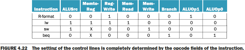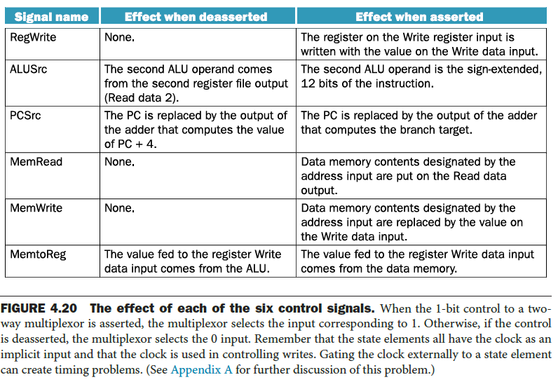 PCSrc外,所有的控制信号可由控制单元 仅根据指令的Opcode和funct字段设置;PCSrc是例外:若指令是beq(由控制单元确定)并且做相等检测的ALU的零输出有效,那么PCSrc控制信号有效。为生成PCSrc信号,需要将来自控制单元(称为“Branch”)的信号与来自ALU的零输出信号相“与” ;