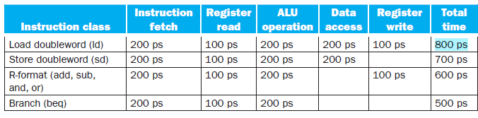 譬如图中设计的一个时钟周期的时长为800ps,即ld指令的时长;执行beq指令时,虽然它本身只需要500ps,但也会消耗800ps;