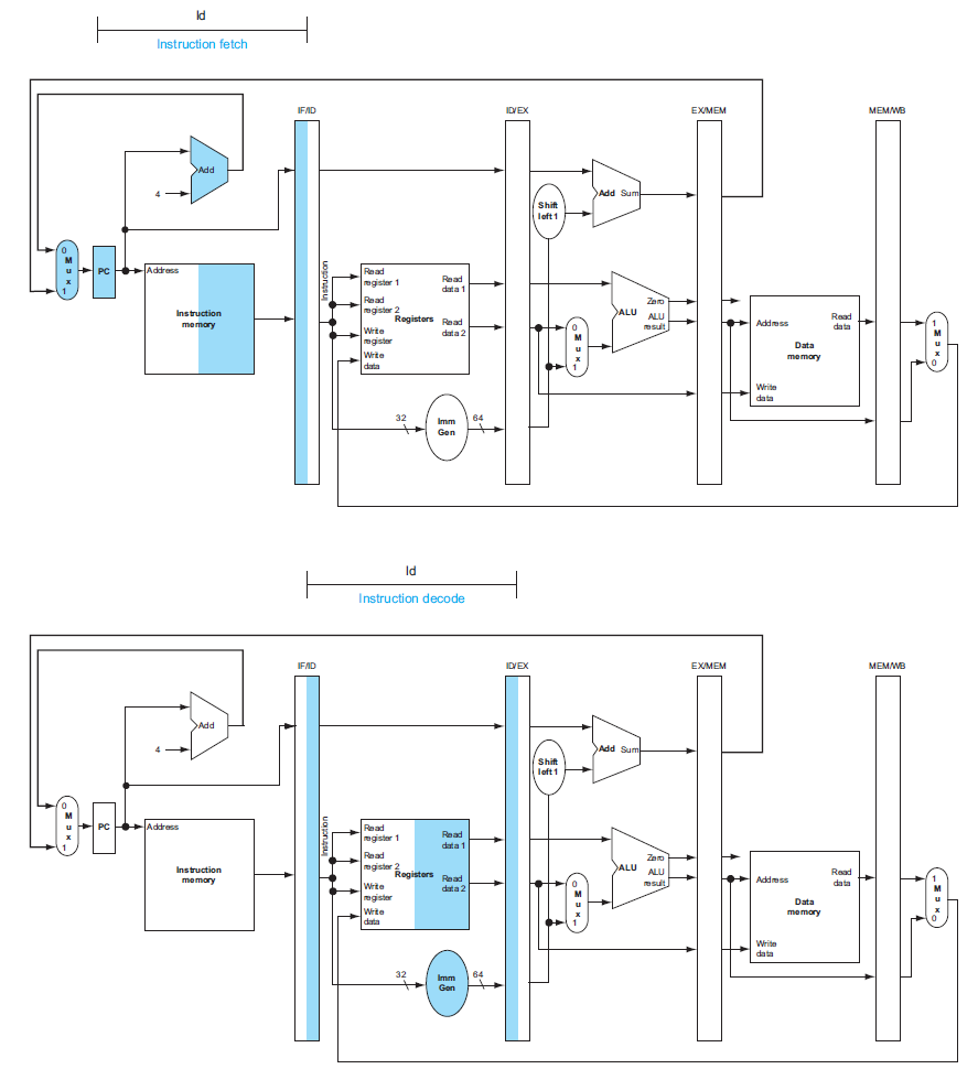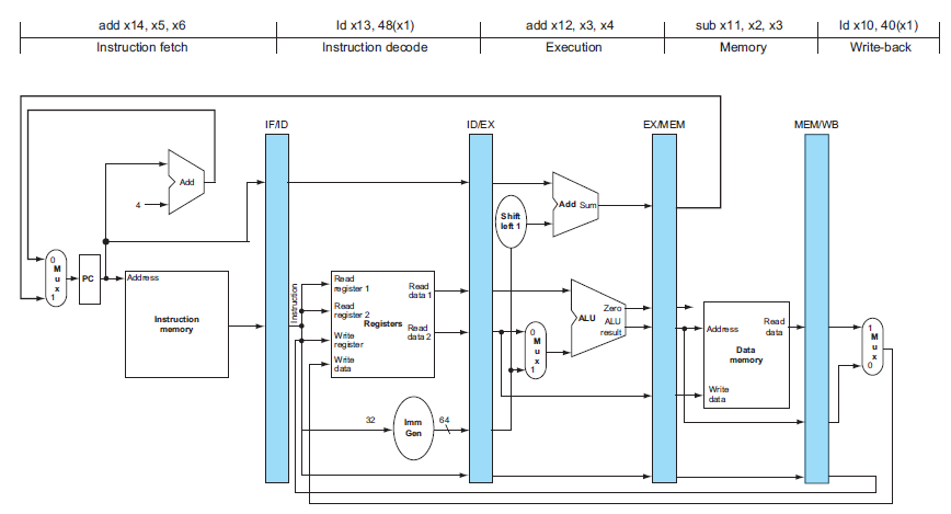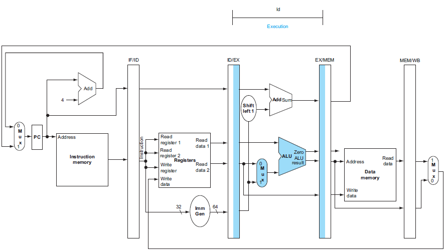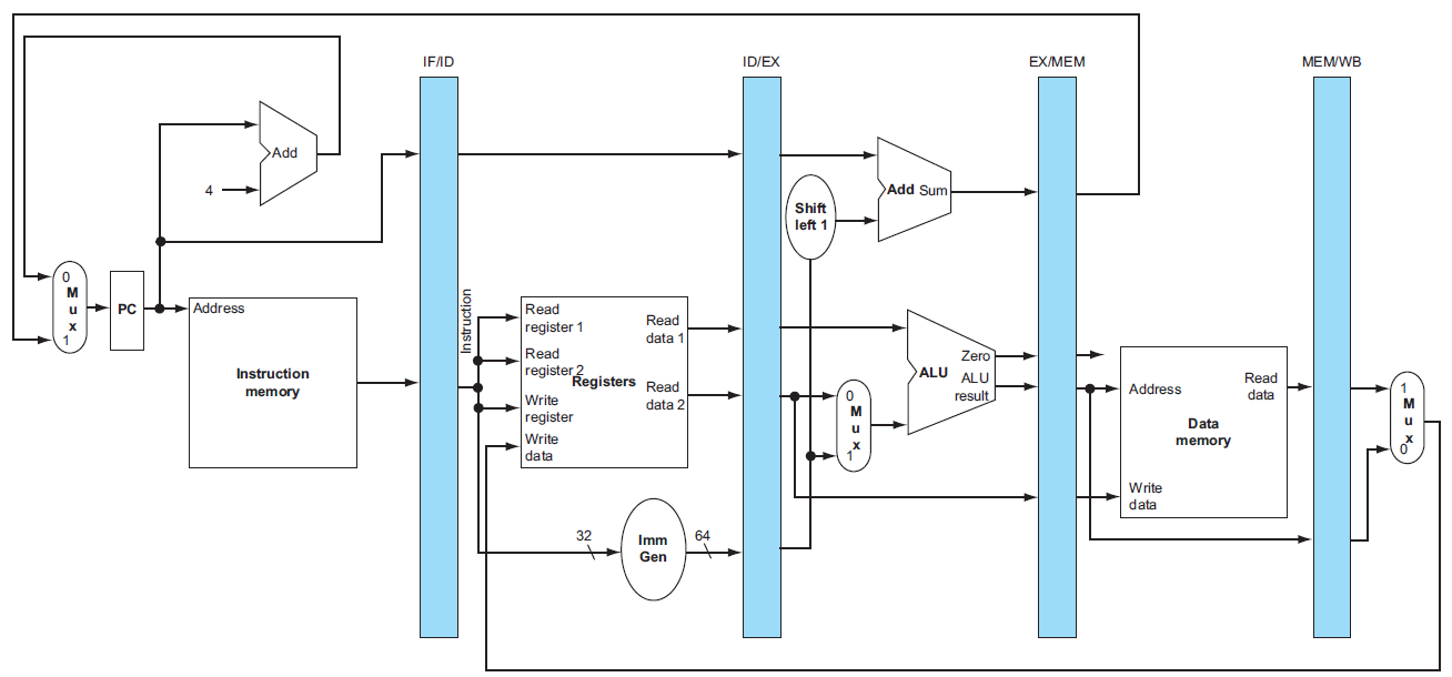 寄存器的位宽:必须足够大以存储通过它们的所有数据。例如,IF/ID寄存器的位宽必须为96位,因为它需要同时存储从存储器中提取出的32位指令以及自增的64位PC地址。目前,其他三个流水线寄存器的位宽分别为256位、193位和128位;