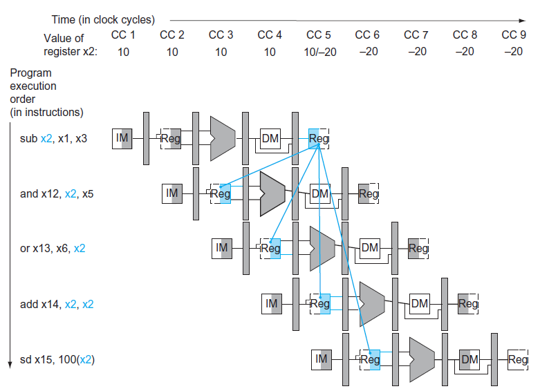 - 如图,紧接着sub指令后面,要使用x2的and、or指令发生了数据冒险(蓝线向后)