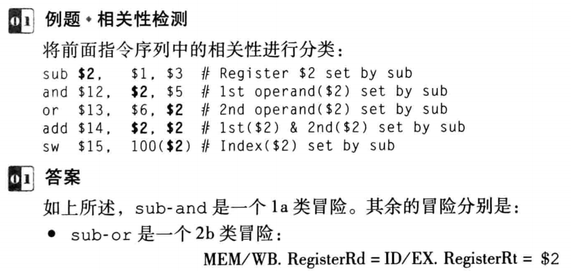 - 当sub指令执行到MEM阶段时,and指令处于EX阶段,所以确定sub-and的类型为EX/MEM. RegisterRd = ID/EX. RegisterRs(高亮的部分由sub、and分别处于的阶段来确定,Rs还是Rt看具体情况)