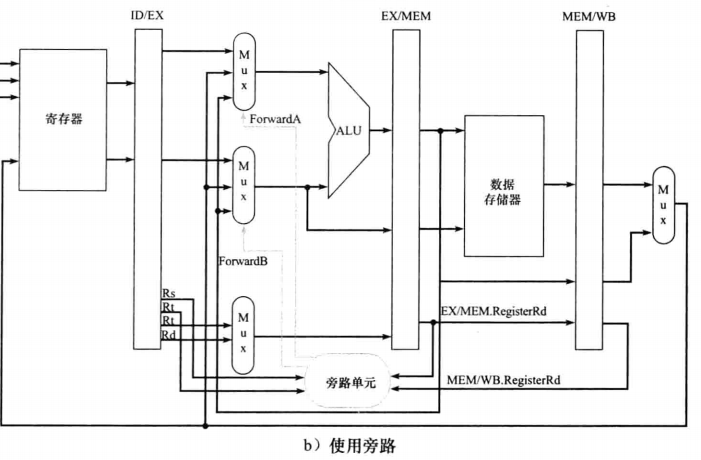 前递单元:以ID/EX的Rt、Rs和EX/MEM、MEM/WB的Rd作为输入,输出的控制信号控制ALU的两个操作数的MUX