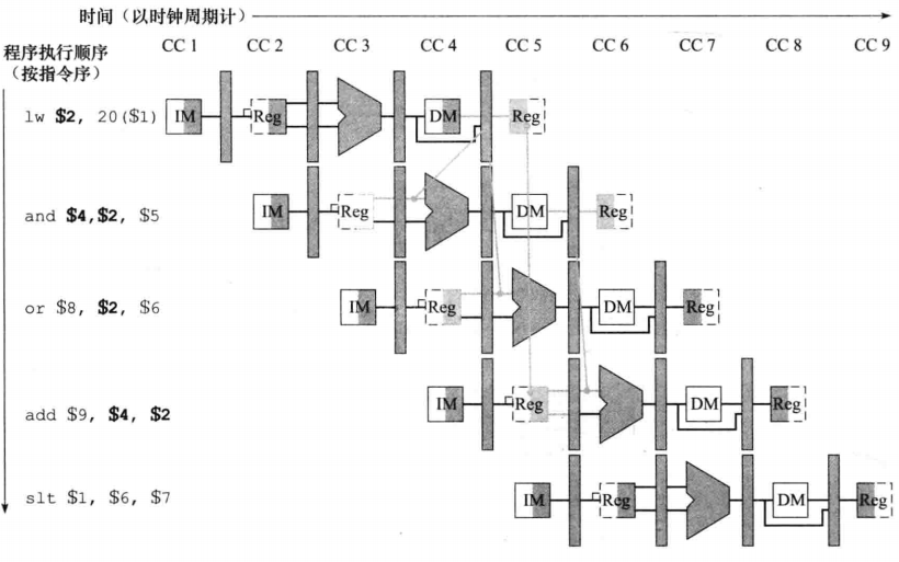 这些控制信号在每个时钟周期都向前传递,但不会产生不 良后果,因为如果控制信号都是 0, 那么所有寄存器和存储器都不进行写操作。