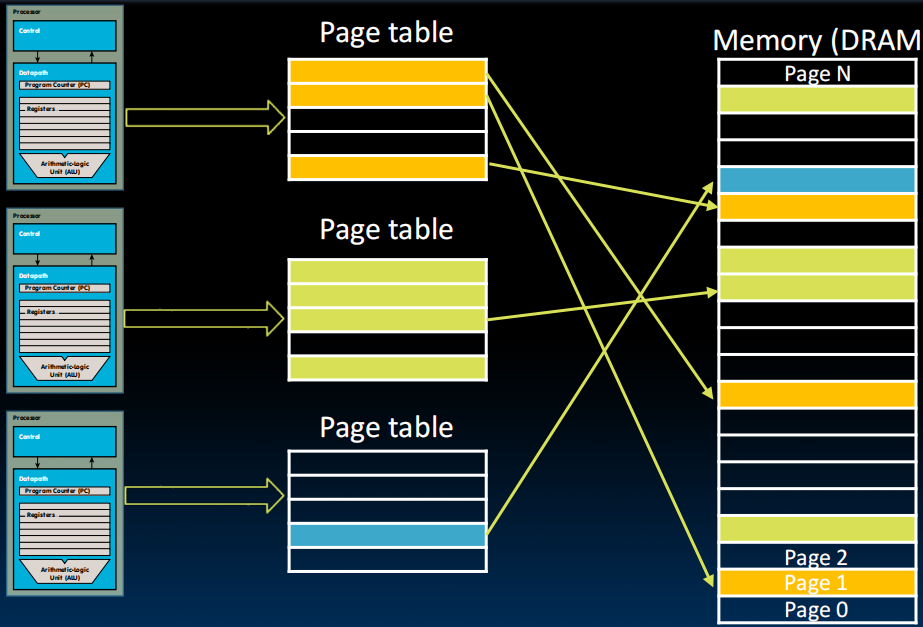 但process之间的共享也是possible的:这通过给process分配相同的物理地址来实现;写保护 (valid bit):1-bit的有效位防止了错写操作