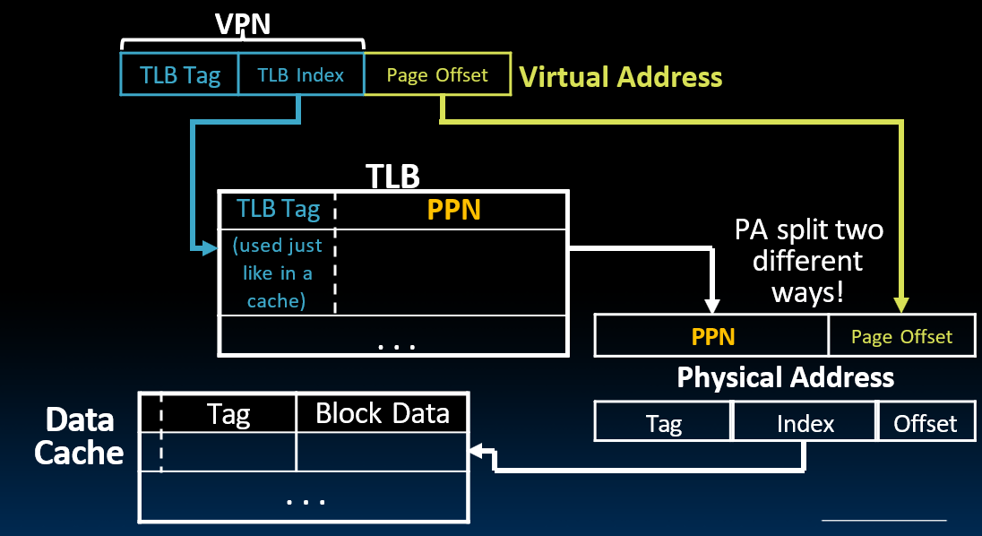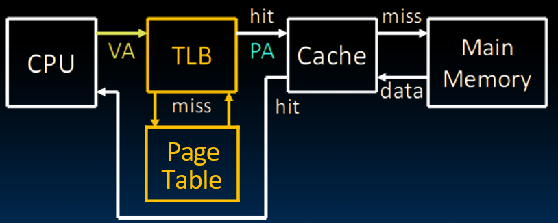 例如TLB中有64个项,每一项对应一个4KiB的页面,则TLB的范围=64*4KiB=256KiB- 我们最先查看的一定是TLB而不是Cache,且cache接收的是物理地址physical address(如果TLB命中的话)