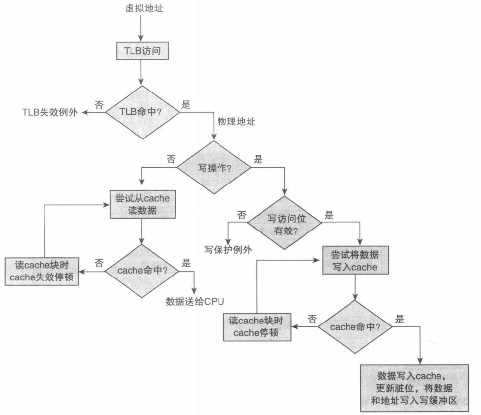 (如果TLB失效,则需要暂停cache访问;等待地址转换完成后,cache再接收物理地址)CPU发送虚拟地址给TLB,TLB将虚拟地址转换为物理地址。
